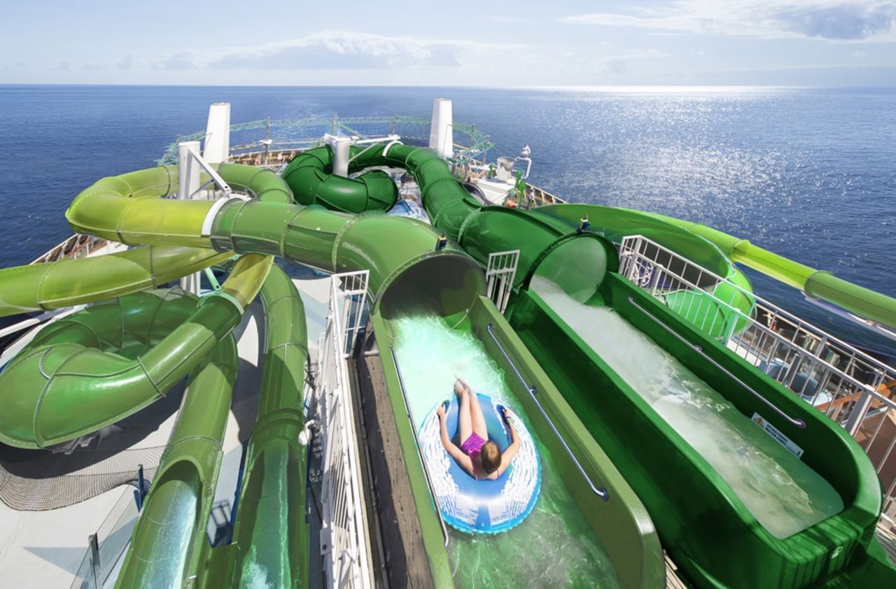 The ship has some mega cool features like a water park, an F1 simulator, a zip line and more.