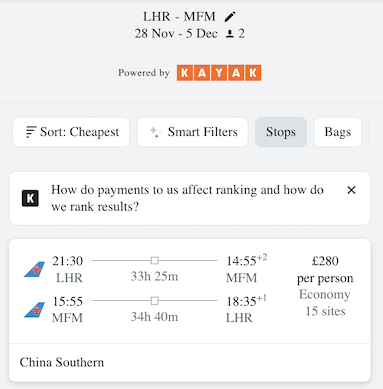Heads-up on a mega deal to Macau, often called the “Las Vegas of the East”. China Southern has return flights from London in November and December for under £300, with checked luggage included.