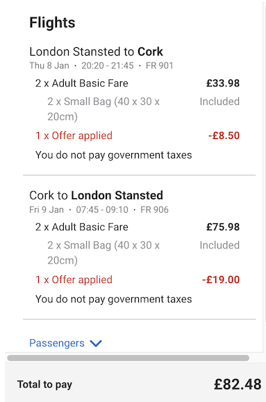 Below is a screenshot of the departure and return fares available for Stansted to Cork, promo fares are highlighted.