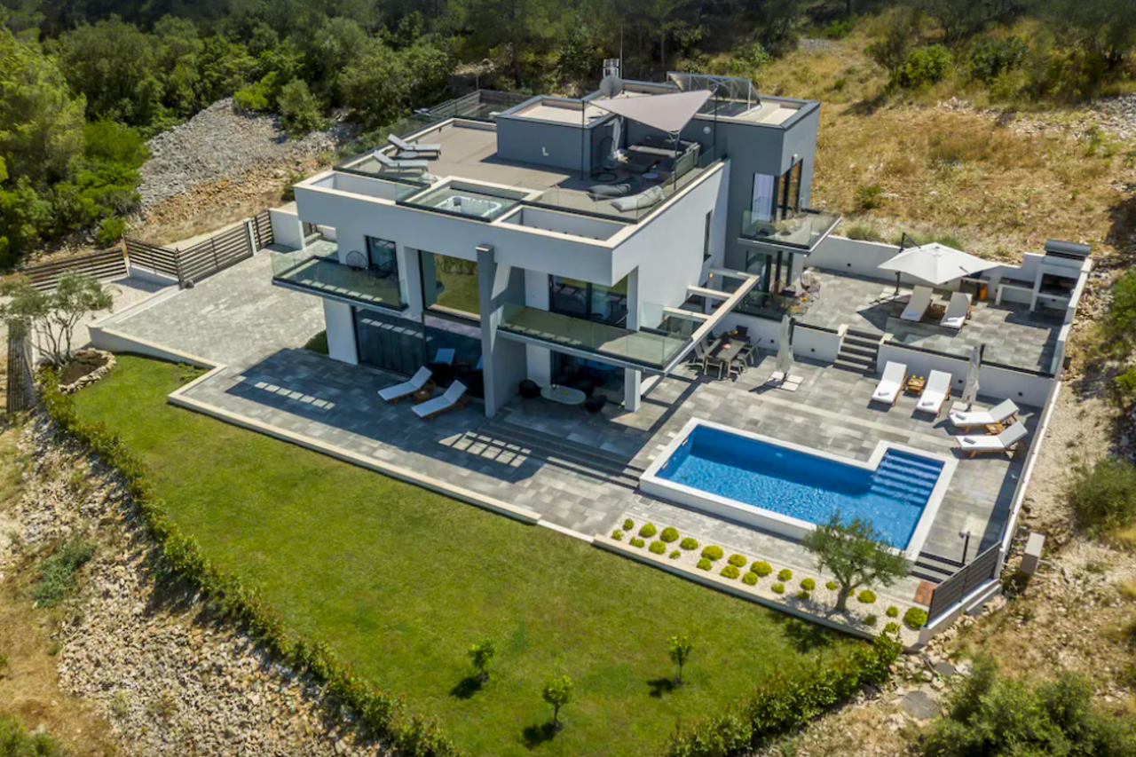 The incredible villa has five large and super-stylish bedrooms, with seaview terraces, a huge living room with a giant TV, a fully equipped kitchen and of course a terrace with a fireplace, grill and large swimming pool.