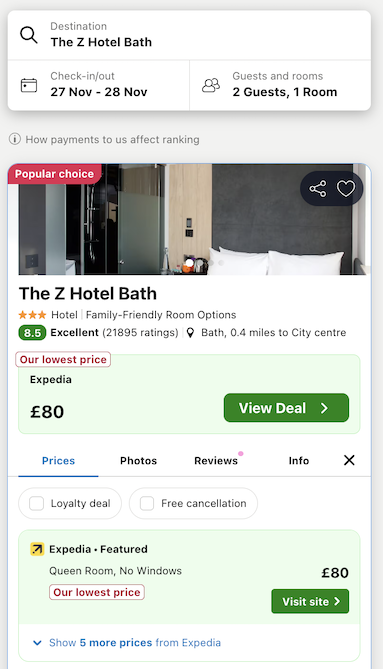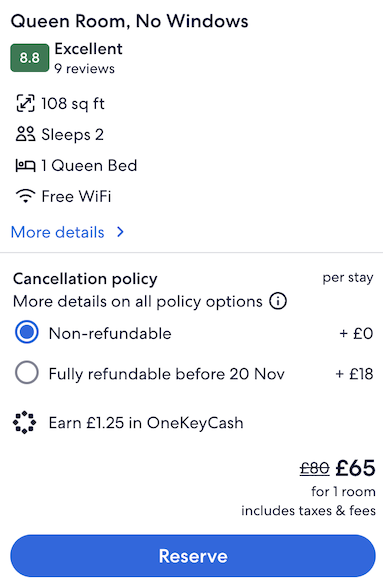 Our lead-price is for window-less rooms, rooms with windows cost £5+