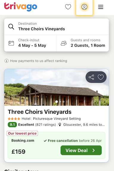 We're linking through Trivago, which will give you options to book via various providers. Also, check direct with the vineyard as in some cases room types might be cheaper booking direct.