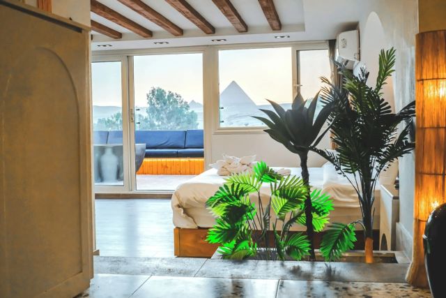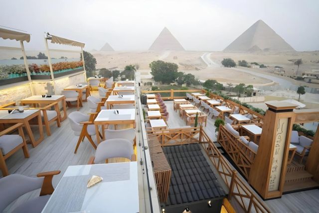 Mateys, you can book a stay at the Great Pyramid Inn in Giza, which offers stunning views of the Pyramid and the Sphinx right from its spacious rooftop terrace. ❤️