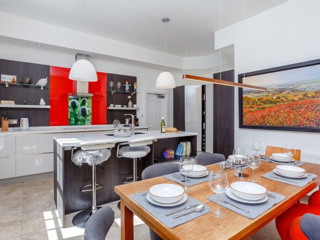 The 3-bedroom apartment sits within Skene House Court, it has two bathrooms, a log burner, free wifi and luxe interior.