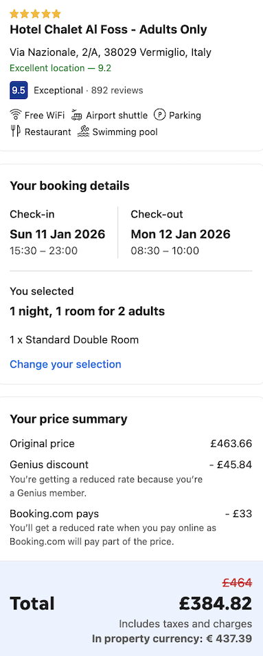When we last looked, Booking.com had knocked off 17% with their Genius discount. You’ll need to log in or sign up to see it – but it’s worth it for the extra savings.