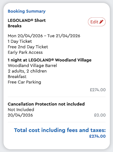 We found resort hotel prices for a family of four from £69 per person (£274 overall). The best prices to stay on-site are for the LEGOLAND® Woodland Village.
