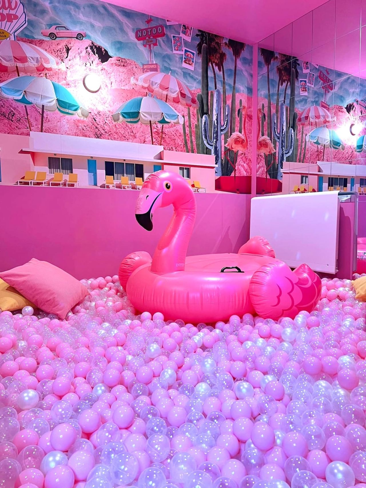 The gorgeous house sleeps 8 with 1 double bed and 2 single beds. Everywhere you look, there's a photo opportunity, with a mirror wall, neon lights, a photo box, girly decorations, and our favourite, a ball pit. If you have not been in one as an adult, you need to ASAP.