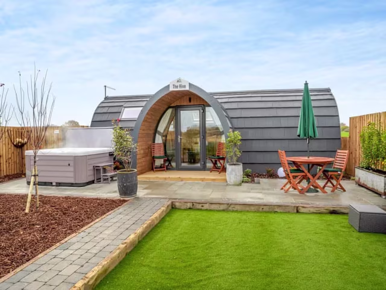 Available on Hoseasons, the lodge is a stunning pod with open-plan living kitchen area, a bedroom, and a super spacious outside area which yep, has a hot tub for romantic evenings.