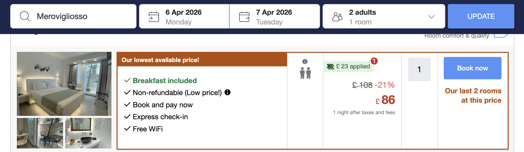 We're linking you through Trivago, so it'll always show you the cheapest prices on the day. While Trivago might show slightly cheaper pricing, when you click through it jumps to £86 room rate on pretty much all April dates when booking via Agoda, the cheapest provider at the time of publish.