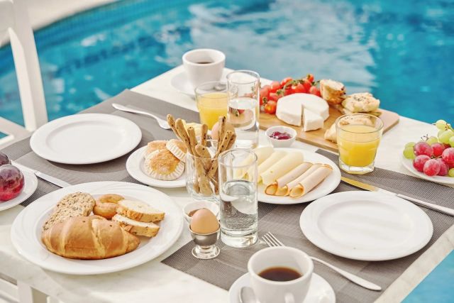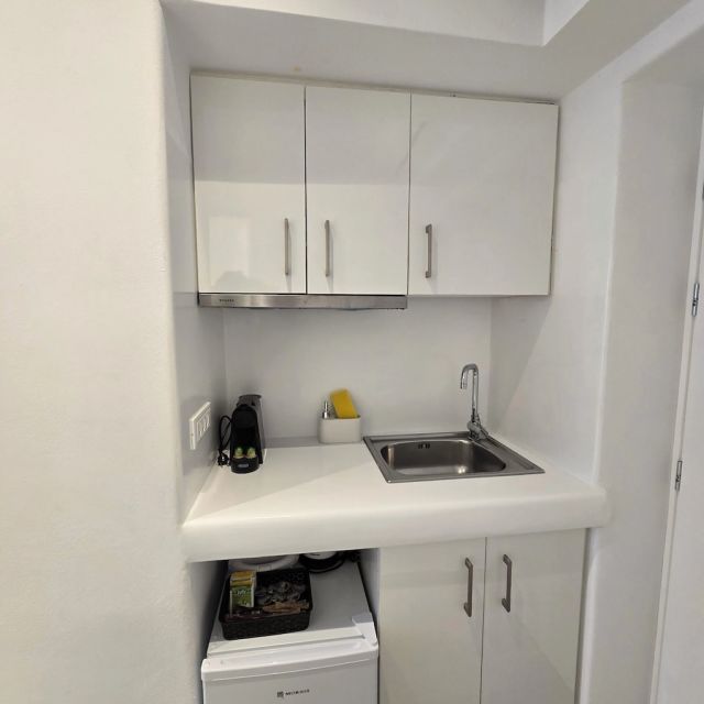 Studios start from £86 a night with breakfast included. Studios have a kitchenette with a coffee machine. There’s a heated outdoor pool, and they do free airport pick-up, which is just nice to not have to think about.