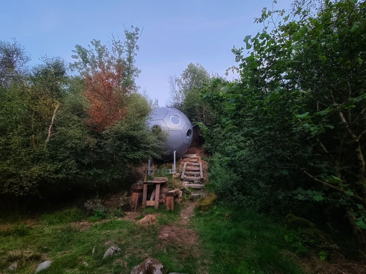 Welcome to The Moon Conker. The tree pod is situated in a valley by a river, in Wales.