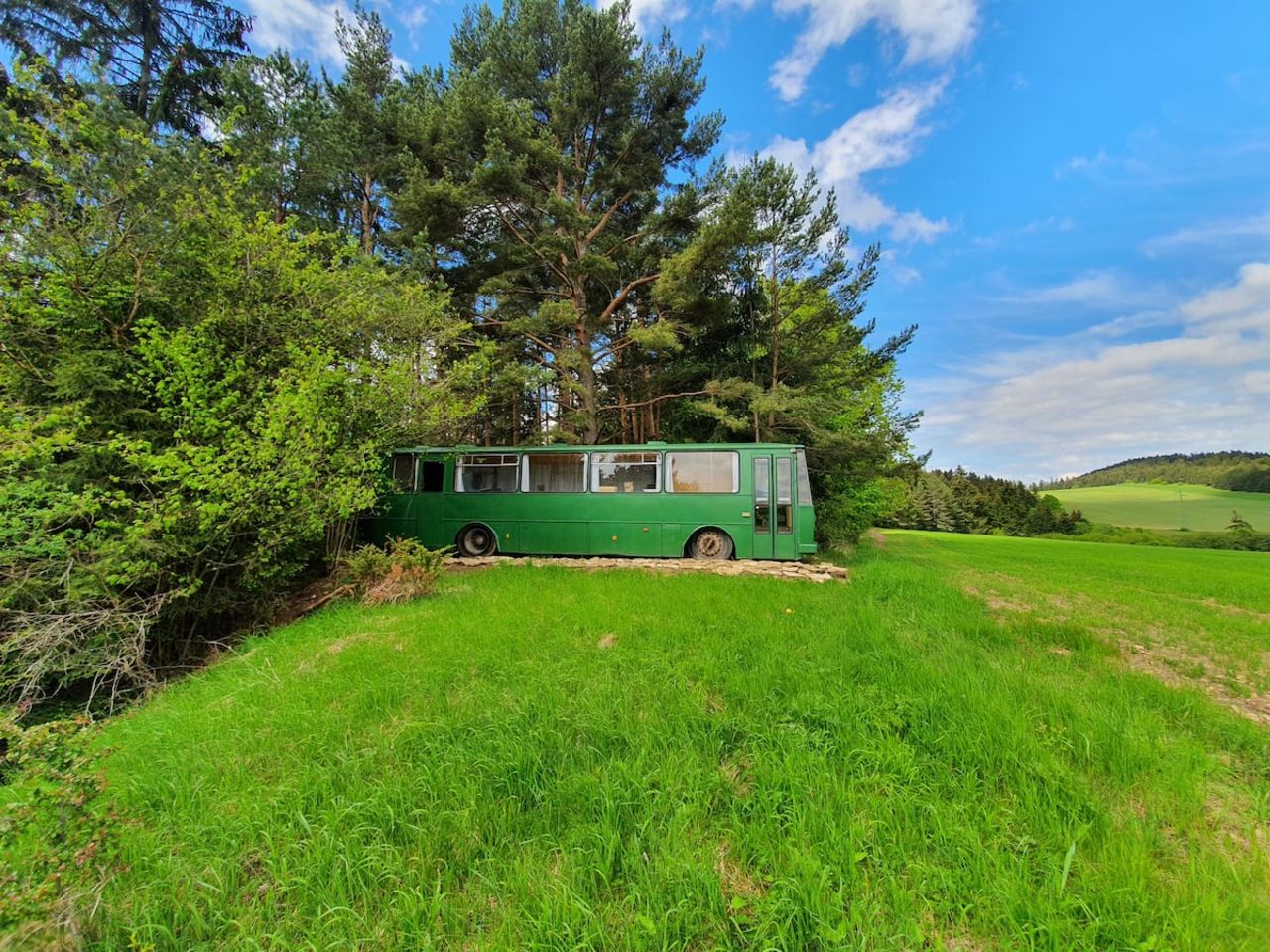 If you're planning a road trip, here's a top-rated, glamping-style experience for you: the Magic Bus! The former vehicle has been turned into a stylish and unique accommodation. You'll have beautiful views over the field, forest and mountains in the distance.