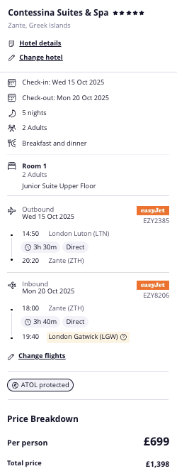 The package includes your return flights. You'll also get suite on an upper floor (hello views 😍) and half board.