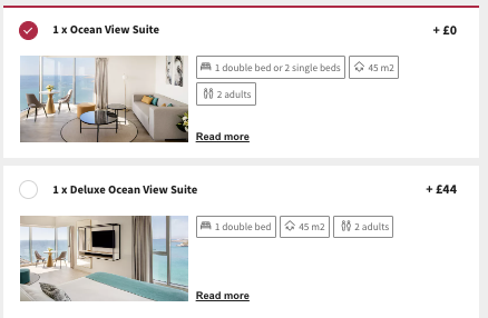 This price is based on sharing between two adults and one child (because one child stays for free when in the sea view suite)! You'll pay £489 each when travelling as a pair of adults in the same room type OR upgrade to the deluxe suite for an extra £21 (total) -- bargain.