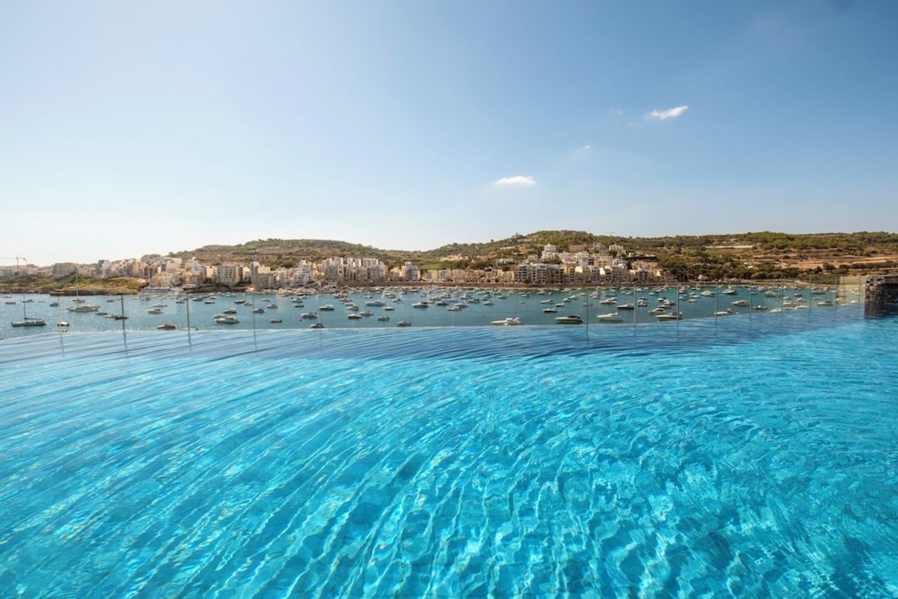 The hotel has stunning sea views, an indoor waterfall, a cave-style pool, and it's located in St. Paul's Bay, perfect for exploring the local sites.
