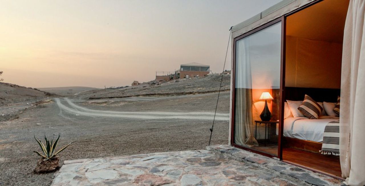 In Agafay Desert: The White Camel, Le Bedouin or The Pearl Camp (all are approximately 35km from Marrakesh in the Agafay Desert. All have comfortable 'glamping-style' tents with AC and private bathroom.)