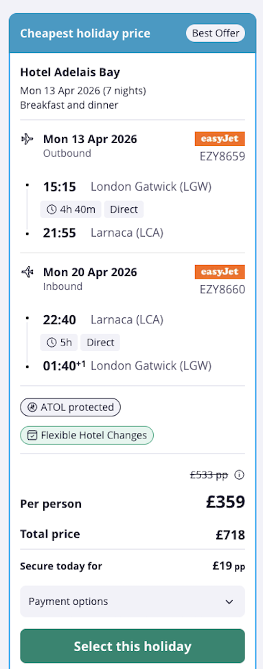 Pirates, we've spotted a great price for a spring week in Cyprus from £399 -- that includes flights, all-inclusive board and a 7-night stay at the well-rated Hotel Adelais Bay.