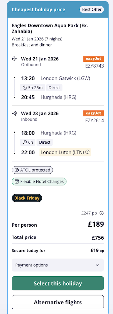 On the date we’ve found, you can even go all-inclusive for the price of a half-board holiday — crazy, right?! 🍹 Other dates are just a few pounds more per person for all-inclusive, so honestly… would be rude not to! 😎
