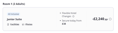 How do we know it’s an error fare? When you click through, the price for this date jumps to over £2,000. But if you choose a different room type (scroll down to see your options), it drops back to the advertised price.