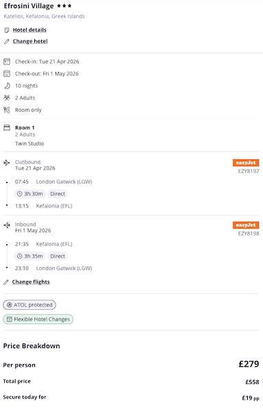 Spend 10 nights in Kefalonia this April with flights included, staying at the well-rated 3-star Efrosini Village — all from £279 per person. 🌞 Some other dates in April cost the same for a shorter stay, so if you can make these dates work, you’ll be getting a few extra nights for free!