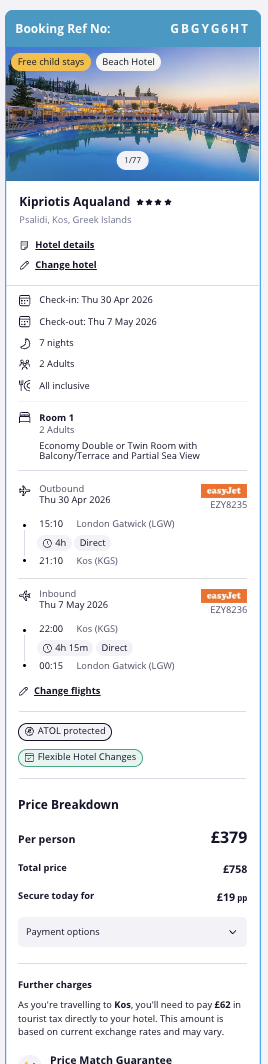 You'll stay at the top-rated Kipriotis Aqualand resort, which has a cracking 4.5/5 rating on Tripadvisor from more than 3,000 reviews.