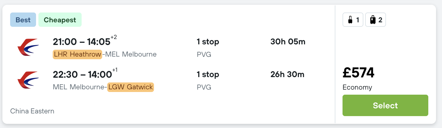 Return flights for March 2026 are coming in from just £574, which is a serious steal for a long-haul trip Down Under! You’ll fly with China Eastern on a one-stop route — so getting to Melbourne just got a whole lot easier.