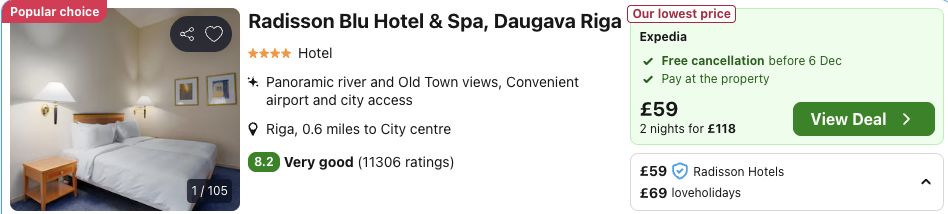 2 nights at the 4-star Radisson Blu Daugava Hotel = £116 / 2 people = £58 per person
