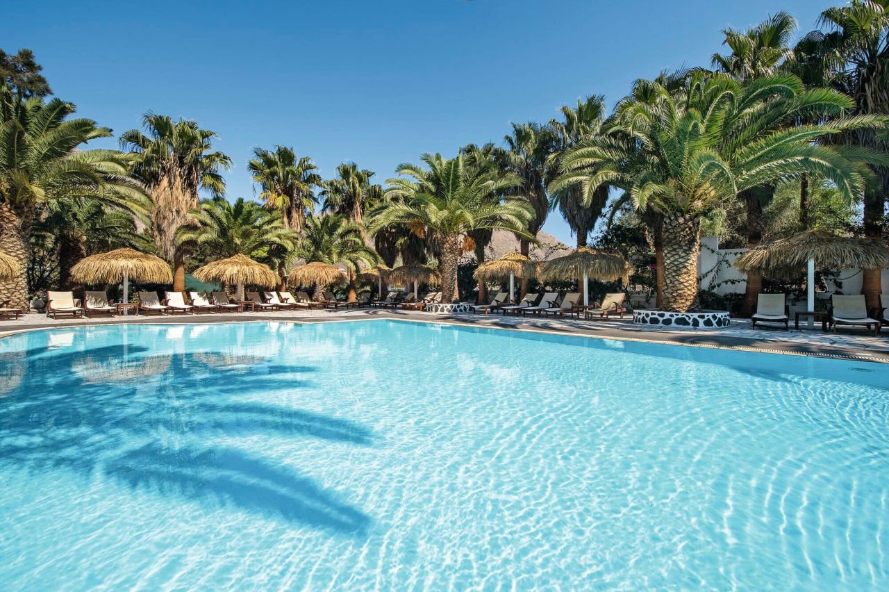 You'll stay at the top-rated 3-star Meltemi Village hotel on Santorini’s southeast coast, in Perissa -- a pretty village dotted with whitewashed villas and framed by jagged volcanic scenery. The hotel has a 4.5/5-star rating on Tripadvisor and has won the Traveller's Choice Award.