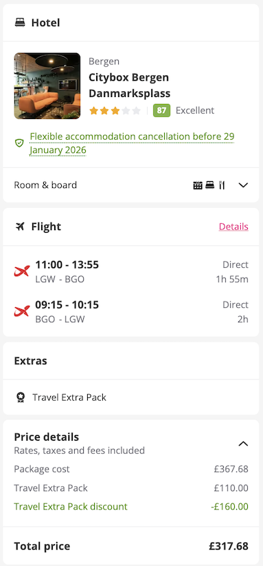 From £159, you can get a long weekend in Bergen with direct flights from London, and a stay at the well-rated Citybox Bergen Danmarksplass.