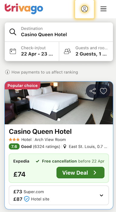 Stay overnight near downtown, Casino Queen Hotel from £74 per night