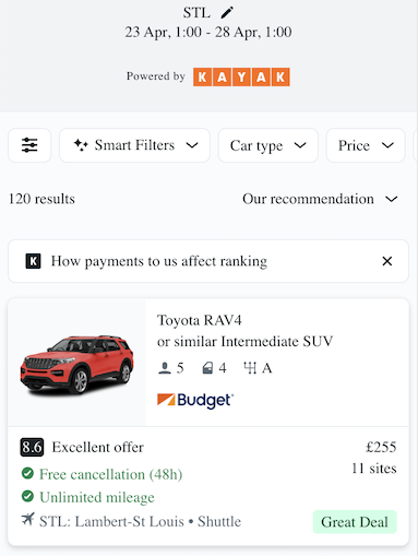 Have a play with pick-up times and the type of car you're looking for. We've gone for a SUV from £255 for 5 days, but there are cheaper/smaller options available.