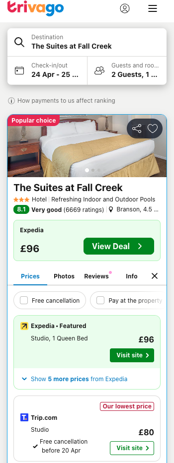 Overnight in Branson, stay at The Suites at Fall Creek, self-catering studio with self-parking availability = £80 per night