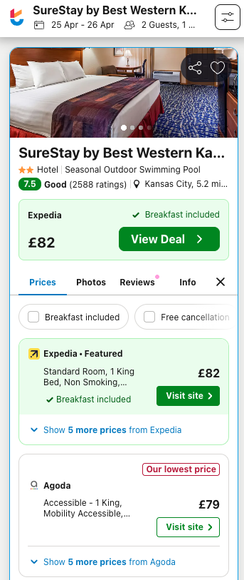 Hotel in Kansas City = £79 per night/2 = £39.50 per person