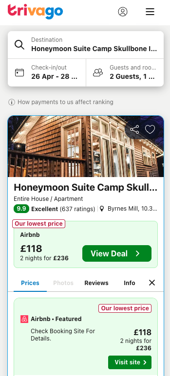 2-night woodland retreat = £236 total/2 = £118 per person