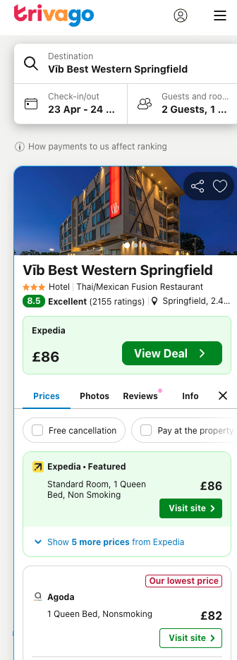 Hotel in Springfield = £82 per night/2 = £41 per person