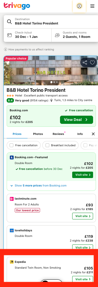 Hotel booking via Trivago, which will always show you the cheapest rates at the time