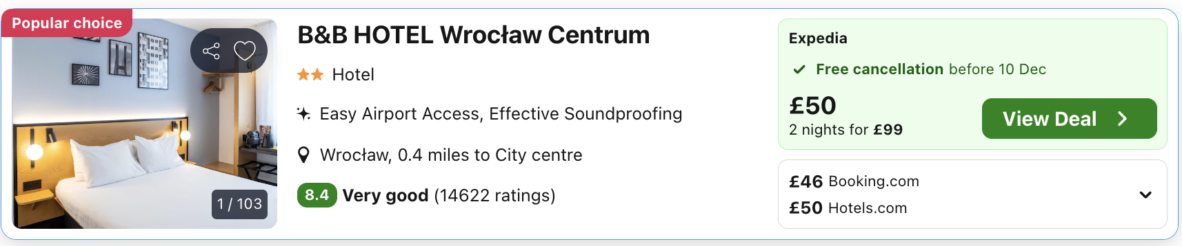 2 nights at the 3-star B&B Hotel Wroclaw Centrum = £91 / 2 people = £45.50 per person