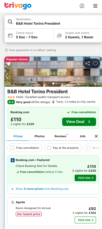 Hotel booking via Trivago, which will always show you the cheapest rates at the time